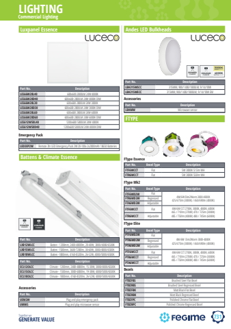 731LIGHTINGTogether we GENERATE VALUECommercial LightingLuxpanel EssencePart No. Bezel Type DescriptionFTF6WD2W Flat 4W/6W Dim2Warm 3000-4000K 425/675lm (3000K) / 460/690lm (4000K) FTR6WD2W RegressedFTA6WD2W AdjustableFTF6WCCT Flat 4W/6W CCT 2700K, 3000K, 4000K, 6000K 465 / 710lm (2700K) 470 / 725lm (3000K) FTR6WCCT Adjustable 485 / 750lm (4000K) 480 / 745lm (6000K)Part No. Bezel Type DescriptionFTF6WCCT Flat 5W 3000K 515lm WHFTR6WCCT Flat 5W 3000K 550lm WHPart No. DescriptionFTBZFBS Brushed Steel Flat BezelFTBZRBS Brushed Steel Regressed BezelFTBZFBK Matt Black Flat BezelFTBZRBK Matt Black Regressed BezelFTBZFPC Polished Chrome Flat BezelFTBZRPC Polished Chrome Regressed BezelPart No. Bezel Type DescriptionPTF6WD2W Flat4W/6W Dim2Warm 3000-4000K 425/675lm (3000K) / 460/690lm (4000K)PTR6WD2W RegressedPTA6WD2W AdjustablePTF6WCCT Flat 4W/6W CCT 2700K, 3000K, 4000K, 6000K 465 / 710lm (2700K) 470 / 725lm (3000K) 485 / 750lm (4000K) 480 / 745lm (6000K) PTR6WCCT RegressedPTA6WCCT AdjustableAndes LED BulkheadsPart No. DescriptionLBA315WSCC 315MM, 900/1400/1800LM, 9/14/18WLBA315WECC 315MM, 900/1400/1800LM, 9/14/18W EMFType EssenceBezelsFType Mk2FType EliteFTYPEBattens & Climate EssencePart No. DescriptionLES66W28L40 600x600 2800LM 24W 4000K LES66W28D40 600x600 2800LM 24W 4000K DIMLES66W28L30 600x600 2800LM 24W 3000K LES66W28D30 600x600 2800LM 24W 3000K DIMLES66W28L60 600x600 2800LM 24W 6000K LES66W28D60 600x600 2800LM 24W 6000K DIMLES612W50L40 1200x600 5000LM 24W 4000KLES612W50D40 1200x600 5000LM 24W 4000K DIMEmergency PackPart No. DescriptionLED3EP2W Remote 3hr LED Emergency Pack 2W 20-100v 2x2000mAh 18650 BatteriesPart No. DescriptionUEM2W Plug and play emergency packUMWS Plug and play microwave sensorPart No. DescriptionLBAMW Microwave sensorAccessoriesAccessoriesCOLOURCHANGE 4000KNEUTRAL WHITE3000KWARM WHITEPOWERCHANGEPOWERCHANGE COLOURCHANGECOLOURCHANGEPart No. DescriptionECL12OLCC Climate - 1200mm, 2400-4800lm, 15-30W, 3000/4000/6500KECL15OLCC Climate - 1500mm, 3000-6000lm, 19-38W, 4000/5000/6500KECL18OLCC Climate - 1800mm, 4160-8320lm, 26-52W, 4000/5000/6500KPart No. DescriptionLXB12WLCC Batten - 1200mm, 2400-4800lm, 20-40W, 3000/4000/6500KLXB15WLCC Batten -1500mm, 3600-7200lm, 30-60W, 3000/4000/6500KLXB18WLCC Batten -1800mm, 4160-8320lm, 26-52W, 4000/5000/6500K