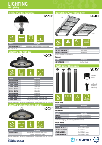 769LIGHTINGTogether we GENERATE VALUEGlow UFO Ultra Switchable High BayLED LightingAdd /D for dali 2.0Qglobe Post-Top Luminaire Qsport High-Power Flood LightGlow UFO Pro High BayPart No. DescriptionQP-CONE-WS-DC/FL 12/16/22W Tri-ColourQP-CONE-WS-DC/DO 12/16/22W Tri-ColourQP-LOU-WS-DC/FL 12/16/22W Tri-ColourQP-LOU-WS-DC/DO 12/16/22W Tri-ColourPart No. DescriptionQGLOBE-WS-500-2CCT Wattage Switchable (30/45/60W), 3000K/4000KPart No. DescriptionQSPORT2-630CW/AS 630W, 5700KQSPORT2-1260CW/AS 1260W, 5700KAdd /D for dali; add /HS for bluetoothAccessoryPart No. DescriptionQSPORT-SHIELD Light Spill Shield1260W630WPart No. DescriptionGU-ULTRA-WS-TC Wattage Switchable (100W/150W/200W),Tri-Colour 4000K/5000K/5700KAdd /EM for emergency; add /MS for microwave sensor; add /MS/EM for both; add /D for daliPart No. DescriptionGU-PRO-100NW 100W 4000KGU-PRO-100CW 100W 6000KGU-PRO-150NW 150W 4000KGU-PRO-150CW 150W 6000KGU-PRO-200NW 200W 4000KGU-PRO-200CW 200W 6000KGU-PRO-240NW 240W 4000KGU-PRO-240CW 240W 6000KGU-PRO-150TC 150W, Tri-Colour (4000K, 5000K and 6000K)GU-PRO-200TC 200W, Tri-Colour (4000K, 5000K and 6000K)Add /EM for emergency; add /MS for microwave sensor; add /MS/EM for both; add /D for daliQpath Bollard LuminaireBollard BasePart No. DescriptionQP-100-BASE 89mm Die-Cast Bollard BasePart No. DescriptionQP-ROOT Soft-Ground Root Mounting KitQP-SHIELD Spill Shield For Rear MountingAttachmentsBollard HeadsAdd /EM for emergency; add /D for dali; add /PH for photocellSoft-Ground Root Mount Kit AccessorySpill Shield Accessory%u00ae %u00ae%u00ae%u00ae%u00ae
