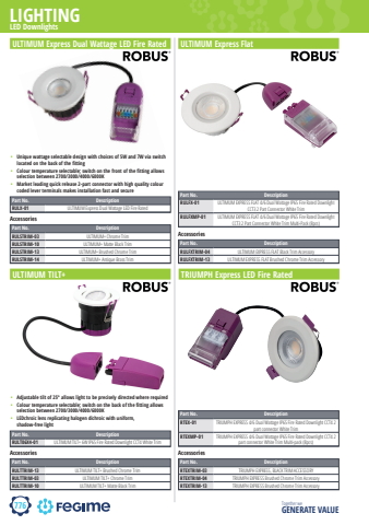 776LIGHTINGTogether we GENERATE VALUELED DownlightsULTIMUM Express Dual Wattage LED Fire Rated%u2022 Unique wattage selectable design with choices of 5W and 7W via switch located on the back of the fitting%u2022 Colour temperature selectable; switch on the front of the fitting allows selection between 2700/3000/4000/6000K%u2022 Market leading quick release 2-part connector with high quality colour coded lever terminals makes installation fast and securePart No. DescriptionRULX-01 ULTIMUM Express Dual Wattage LED Fire RatedAccessoriesPart No. DescriptionRULSTRIM-03 ULTIMUM+ Chrome TrimRULSTRIM-10 ULTIMUM+ Matte Black TrimRULSTRIM-13 ULTIMUM+ Brushed Chrome TrimRULSTRIM-14 ULTIMUM+ Antique Brass TrimPart No. DescriptionRULT06X4-01 ULTIMUM TILT+ 6W IP65 Fire Rated Downlight CCT4 White Trim%u2022 Adjustable tilt of 25%u00b0 allows light to be precisely directed where required%u2022 Colour temperature selectable; switch on the back of the fitting allows selection between 2700/3000/4000/6000K %u2022 LEDchroic lens replicating halogen dichroic with uniform, shadow-free lightULTIMUM TILT+AccessoriesPart No. DescriptionRULTTRIM-13 ULTIMUM TILT+ Brushed Chrome TrimRULTTRIM-03 ULTIMUM TILT+ Chrome TrimRULTTRIM-10 ULTIMUM TILT+ Matte Black TrimrobusrobusPart No. DescriptionRTEX-01 TRIUMPH EXPRESS 4/6 Dual Wattage IP65 Fire Rated Downlight CCT4 2 part connector White TrimRTEXMP-01 TRIUMPH EXPRESS 4/6 Dual Wattage IP65 Fire Rated Downlight CCT4 2 part connector White Trim Multi-pack (8pcs)TRIUMPH Express LED Fire RatedAccessoriesPart No. DescriptionRTEXTRIM-03 TRIUMPH EXPRESS, BLACK TRIM ACCESSORYRTEXTRIM-04 TRIUMPH EXPRESS Brushed Chrome Trim AccessoryRTEXTRIM-13 TRIUMPH EXPRESS Brushed Chrome Trim AccessoryrobusULTIMUM Express FlatAccessoriesPart No. DescriptionRULFXTRIM-04 ULTIMUM EXPRESS FLAT Black Trim AccessoryRULFXTRIM-13 ULTIMUM EXPRESS FLAT Brushed Chrome Trim AccessoryrobusPart No. DescriptionRULFX-01 ULTIMUM EXPRESS FLAT 4/6 Dual Wattage IP65 Fire Rated Downlight CCT3 2 Part Connector White TrimRULFXMP-01 ULTIMUM EXPRESS FLAT 4/6 Dual Wattage IP65 Fire Rated Downlight CCT3 2 Part Connector White Trim Multi-Pack (8pcs)